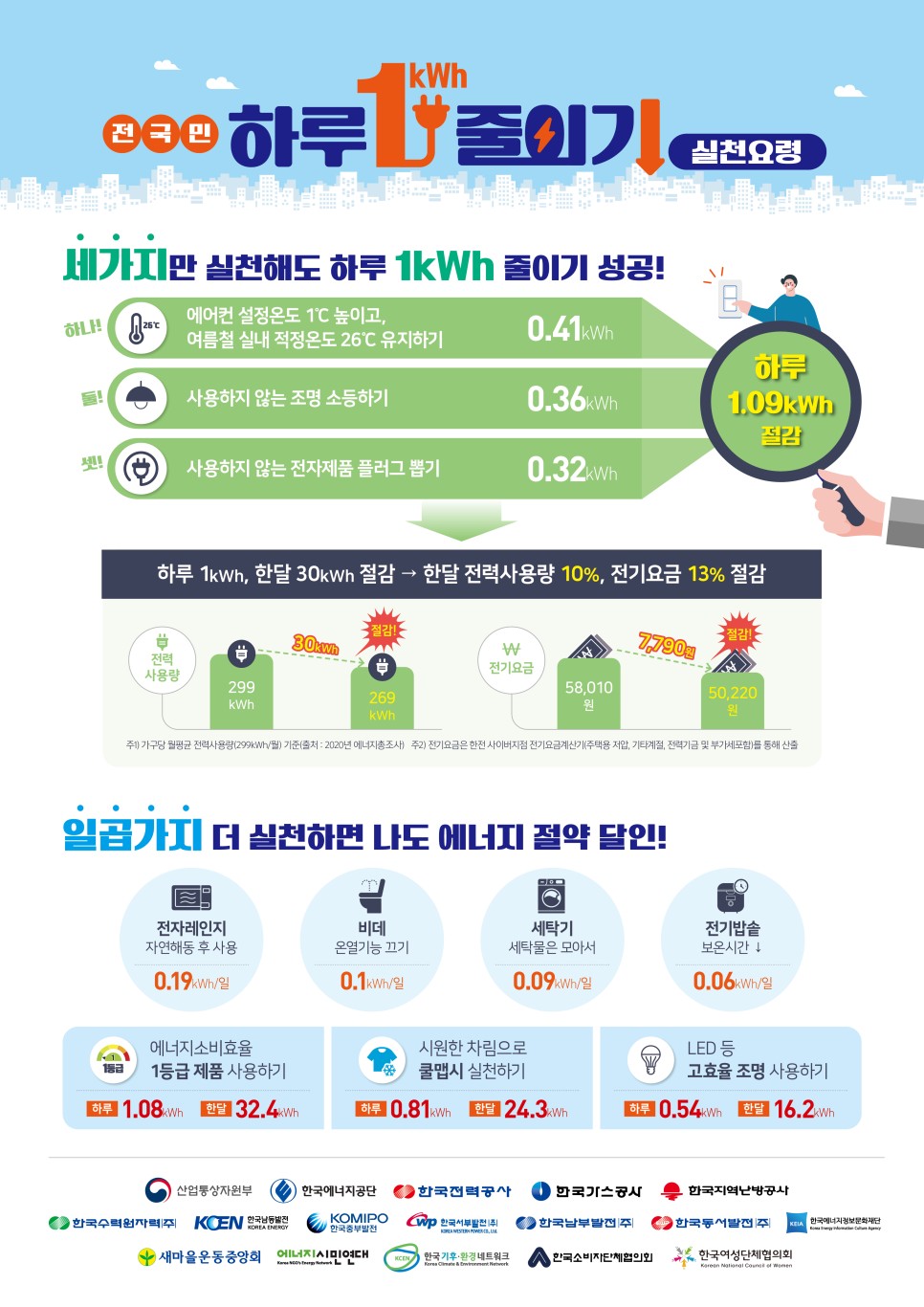 하루1kWh, 한달 30kWh 절감 -> 한달 전력사용량 10%, 전기요금 13% 절감