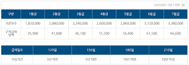 ✔ 수급기간 : 고용보험 가입기간(보험료 납입기간)에 따라 120~210일 지급
