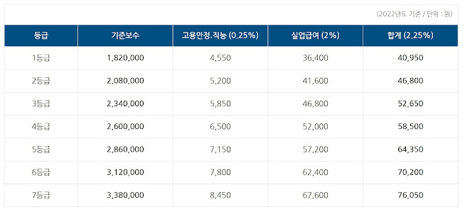 선택한 '기준보수액'의 2.25%(고용안정, 직능 0.25%, 실업급여 2%)