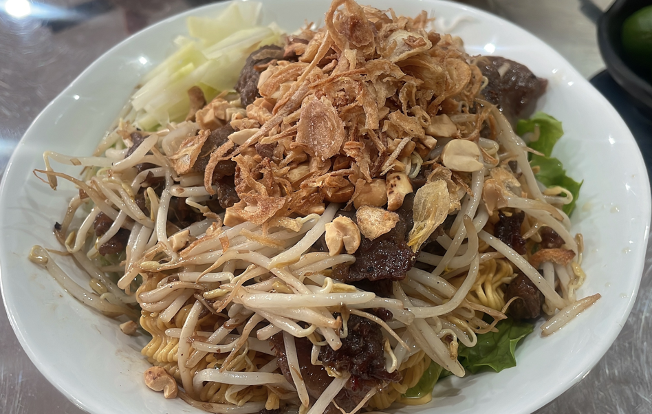 분보남보는 소고기, 숙주, 샬롯, 향채, 땅콩 등을 첨가하여 만든 국수입니다.
