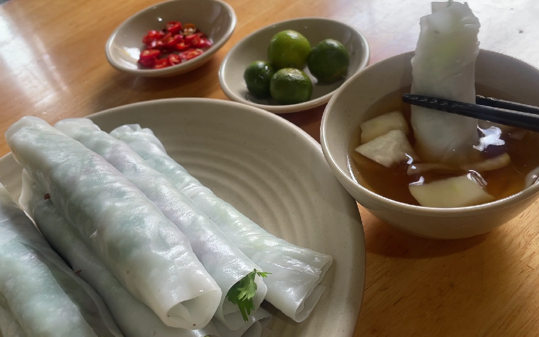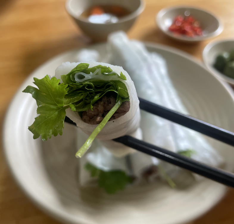 퍼꾸온은 볶은 소고기와 채소를 조금 두꺼운 라이스페이퍼에 말아서 느억맘 소스에 찍어 먹는 음식이었어요.